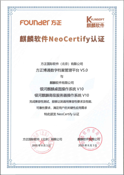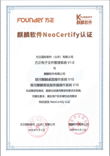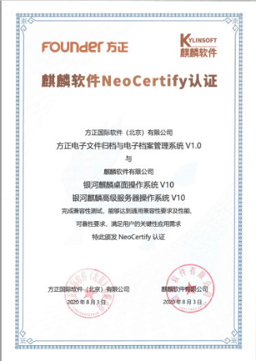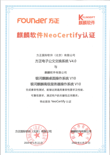 今年以来,由方正国际自主研发的电子签章系统、电子公文交换系统、电子文件管理系统和电子文件归档与电子档案管理系统等多款产品已陆续与银河麒麟操作系统V10完成兼容性互认证测试,取得了麒麟软件NeoCertify认证证书;充分证明方正信创产品在新一代操作系统麒麟V10上运行稳定,具备高可用性,能够满足用户的关键性应用需要;也进一步展示了信息技术应用创新生态协同发展日臻完善。