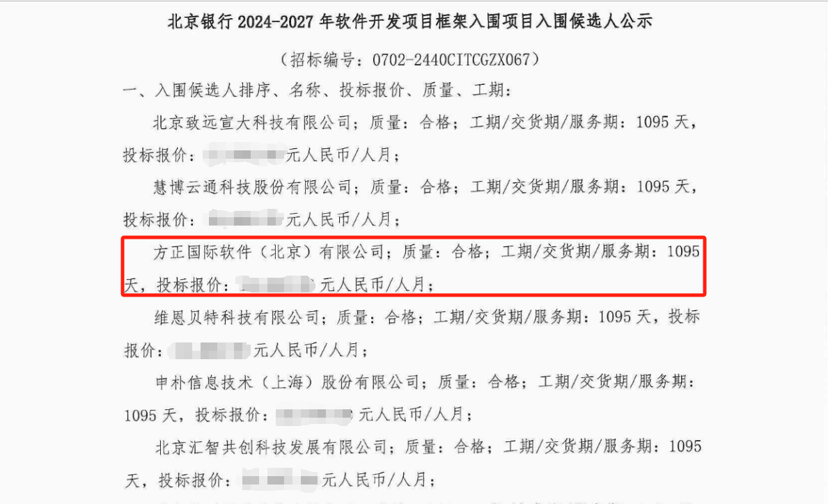 • 中标喜报!方正国际成功中标北京银行软件开发及技术人力框架入围采购项目2024年08月09日